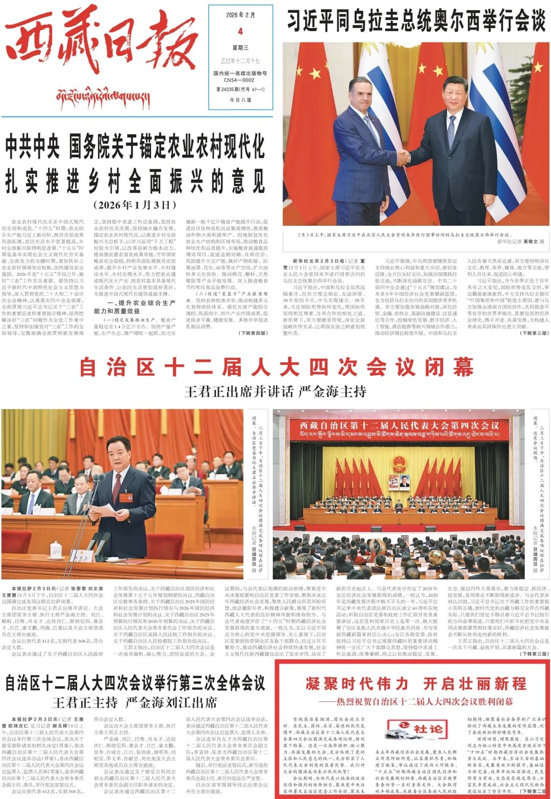 西藏自治区第十二届人民代表大会第四次会议、政协第十二届西藏自治区委员会第四次会议圆满完成各项议程,分别于2月3日、2月2日在拉萨胜利闭幕。