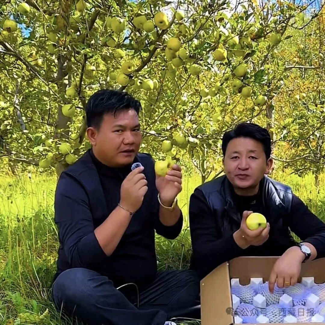 图为普布旦增在林芝嘎玛农场直播售卖当地苹果。(普布旦增供图)