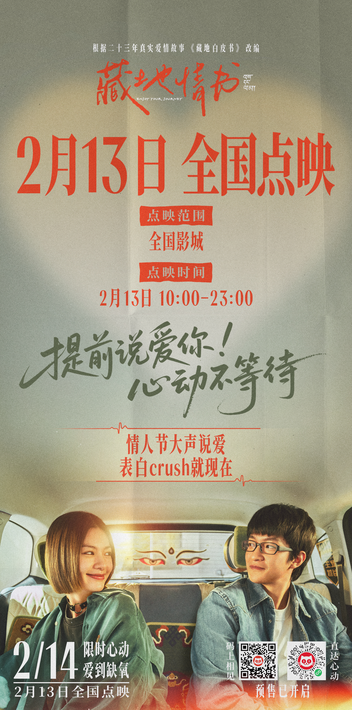 电影原型夫妇从相识至今二十三年仍然相爱如初,在越来越多年轻男女习惯回避爱、不敢表达爱的当下,影片的出现让人们重拾爱的勇气与信心,相信灵魂共鸣、思想同频的爱情不仅存在于童话中,也真实且具体地发生在我们身边。毛铭基与傅真的故事提供了最浪漫的爱情范本,是“爱”存在于世间的最好证明,因此电影也成为了许多观众的情人节首选表白“嘴替”,在极度美好纯爱的氛围之下,那些怯于说出口的喜欢,让《藏地情书》替你传达,愿每一位走进电影院的观众都能收获与毛铭基和傅真一样长久且甜蜜的幸福。
