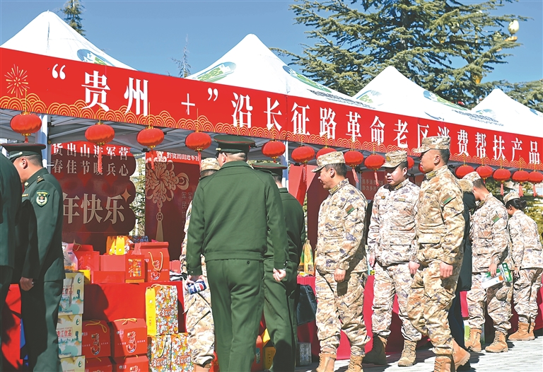 走近展销会现场,暖心的拥军氛围扑面而来,只见展区划分清晰、品类丰富,每一处都凝聚着对官兵的深情关怀。在“‘黔货进军营’‘贵州+’沿长征路革命老区消费帮扶产品推荐”专场前,商户们认真细心地向前来购物的官兵介绍产品,购买氛围热烈,同时为方便现场官兵与家乡亲朋好友分享特色产品,还专门增设快递物流点,为广大官兵提供即买现寄,省心便利的“一站式”服务保障。