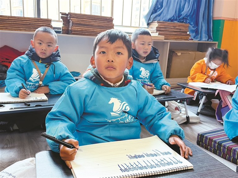 图为央达教育公益托管课堂上,孩子们练习藏文书法。记者 拉巴桑姆 摄