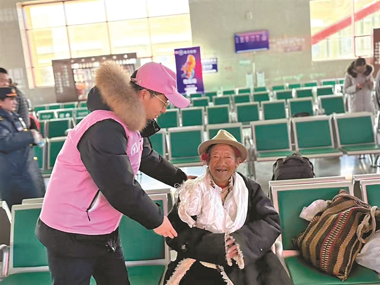 图为在中国铁路青藏集团有限公司拉萨车务段日喀则站内,“小花朵青年志愿服务队”志愿者在为旅客提供服务。记者 鹿丽娟 摄