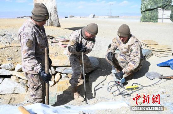 在5592哨所,战士们在维修台阶。