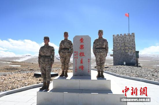 查果拉哨所,战士们与主峰标志性石碑合影。