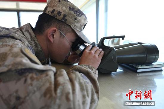 在查果拉哨所,战士吸着氧气执行观察任务。