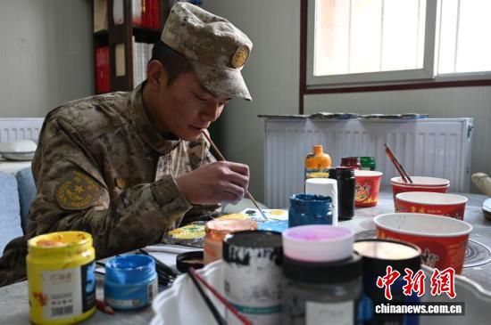 在5592哨所,战士在画石头画。