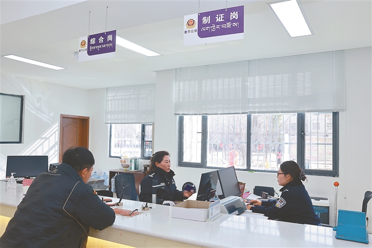 图为墨竹工卡县公安局交警大队服务大厅内,民警在为市民办理业务。