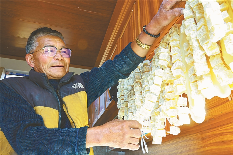 图为墨竹工卡县工卡镇格桑村奶牛良种养殖户挡桑晾晒奶渣。记者 黄志武 本报通讯员 洛克 摄