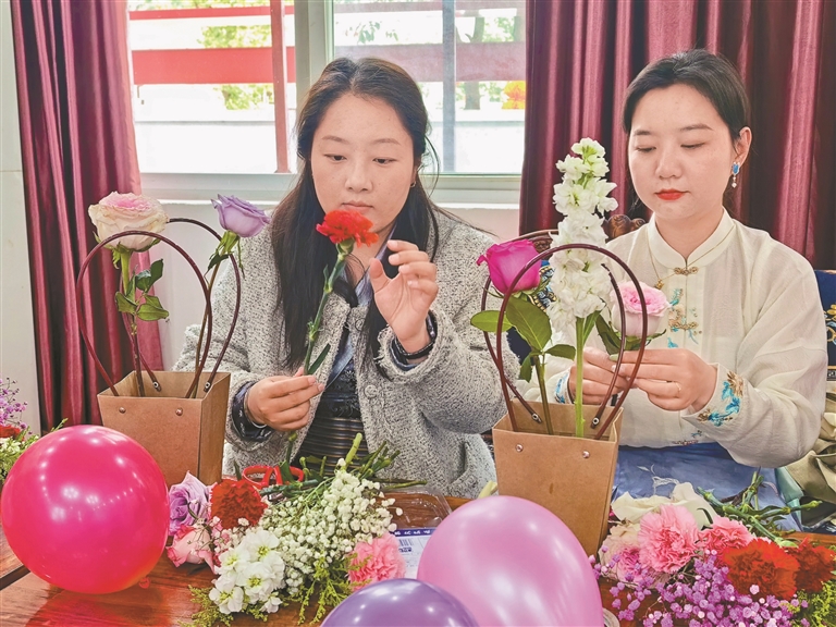活动现场花香四溢、暖意融融。花艺老师围绕花材识别、修剪技巧、色彩搭配等进行细致讲解与示范,手把手指导大家选材、剪枝、定形、点缀。大家在花香中舒缓压力、陶冶情操,在互动中增进情谊、凝聚共识,充分展现了新时代女性自信优雅、积极向上的精神风貌。