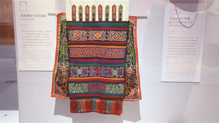 在藏北牧区,妇女们佩戴的饰件“马牙邦典”也别具一格。这种五彩围裙上端,堆贴着竖条装饰,形状酷似马的牙齿,故而得名。在这件展品的背后,还藏着一个家族两代人对技艺的坚守与传承,它不仅是装饰品,更是牧区文化与情感的象征。