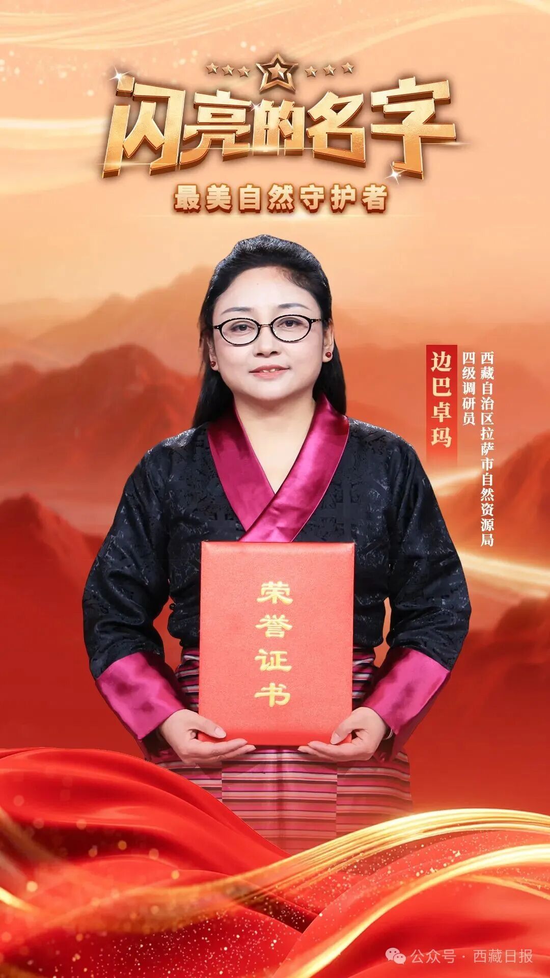 边巴卓玛,女,藏族,1981年7月生,中共党员,西藏自治区拉萨市自然资源局四级调研员。她用心用情,聚焦当地城乡居民住房、土地产权不清等历史遗留难题,深入一线调研,积极创新数字化服务,协同推动各部门累计解决1.82万余户 “办证难”,完成全市78个自建小区不动产登记历史遗留问题,得到群众广泛好评。她立足实际,运用“藏汉双语”开展政策宣讲、普法宣传,引导农牧民群众依法依规用地,推动全市草原确权工作走在前列。曾获拉萨市先进工作者等荣誉。
