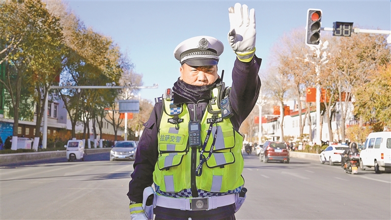 图为拉萨交警定点值守中。记者 鹿丽娟 摄