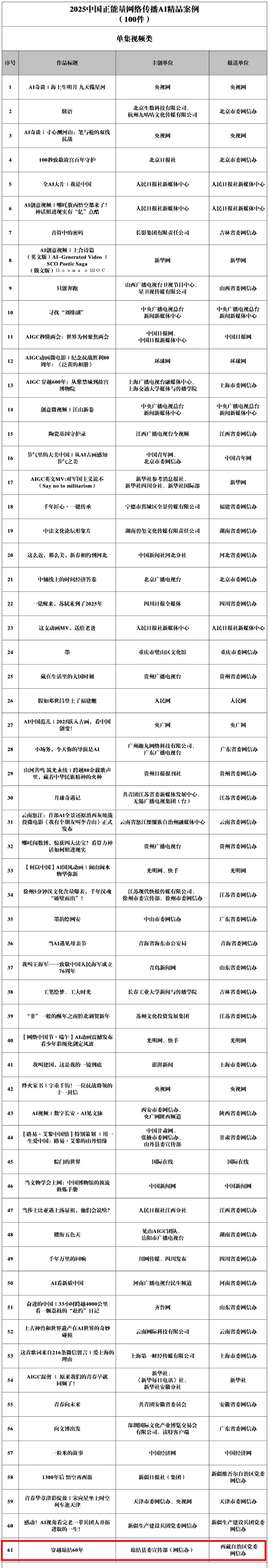 中央网信办2025中国正能量网络传播AI精品案例征集展播活动遴选结果日前出炉。西藏自治区一部作品入选,由琼结县委宣传部(网信办)主创的《穿越琼结60年》入选“单集视频类”精品案例。祝贺!
