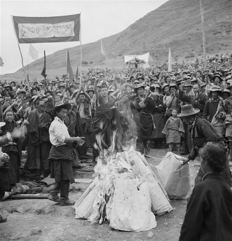图为翻身农奴焚烧契约(1959年摄)。