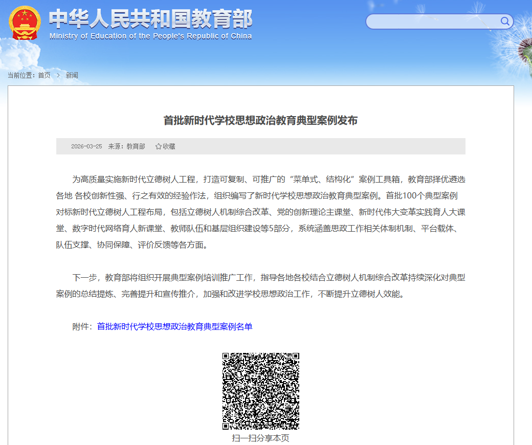 本次遴选由教育部统一组织,面向全国各级各类学校,聚焦立德树人工程布局,包括立德树人机制综合改革、党的创新理论主课堂、新时代伟大变革实践育人大课堂、数字时代网络育人新课堂、教师队伍和基层组织建设五大方向,最终确定100个具有引领性、创新性、可复制性的典型案例,为全国思政教育提供 “样板范式”。