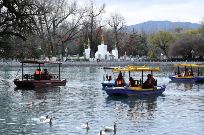3月8日,西藏拉萨宗角禄康公园,市民乘游船赏春。古城拉萨杨柳发芽、桃花初放,春意渐浓。