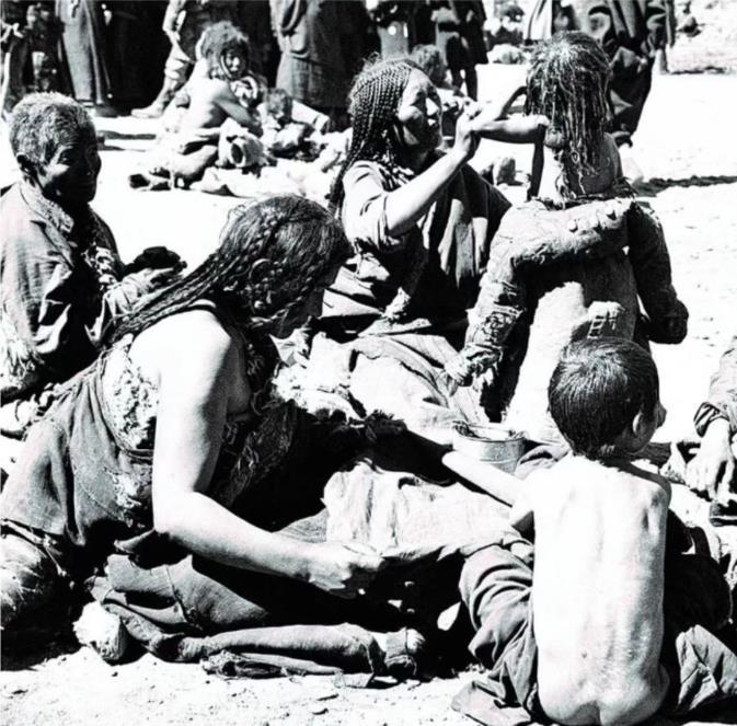 旧西藏的妇女和儿童在街上乞讨。新华社发