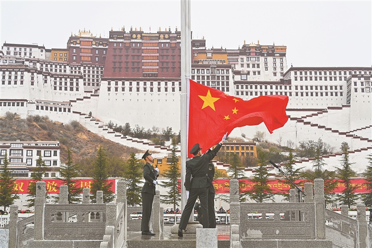 3月28日上午,纪念西藏百万农奴解放67周年“升国旗 唱国歌”仪式在拉萨布达拉宫广场举行。图为仪式现场。记者 次仁平措 摄