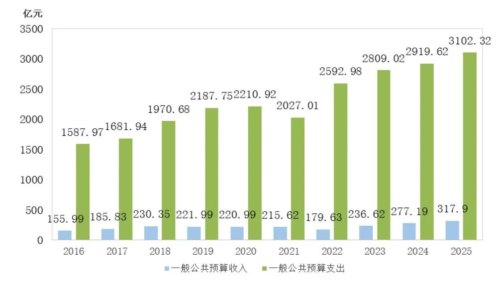 图11 2016-2025年一般公共预算收入和一般公共预算支出