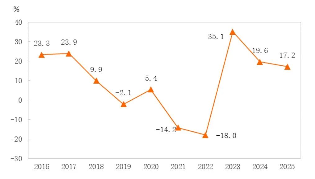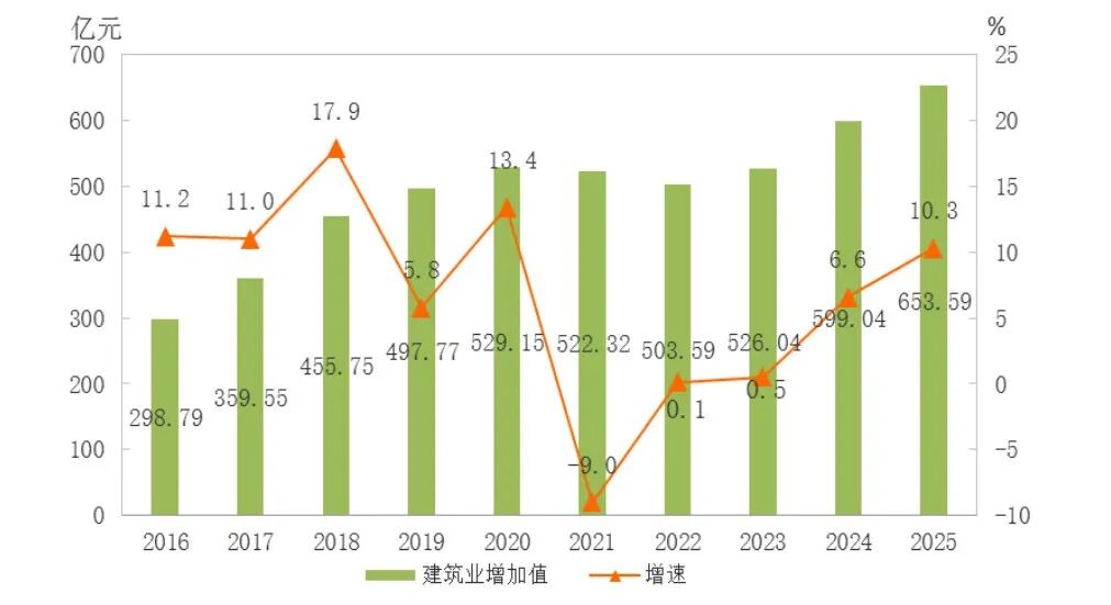 图4 2016-2025年建筑业增加值及其增长速度