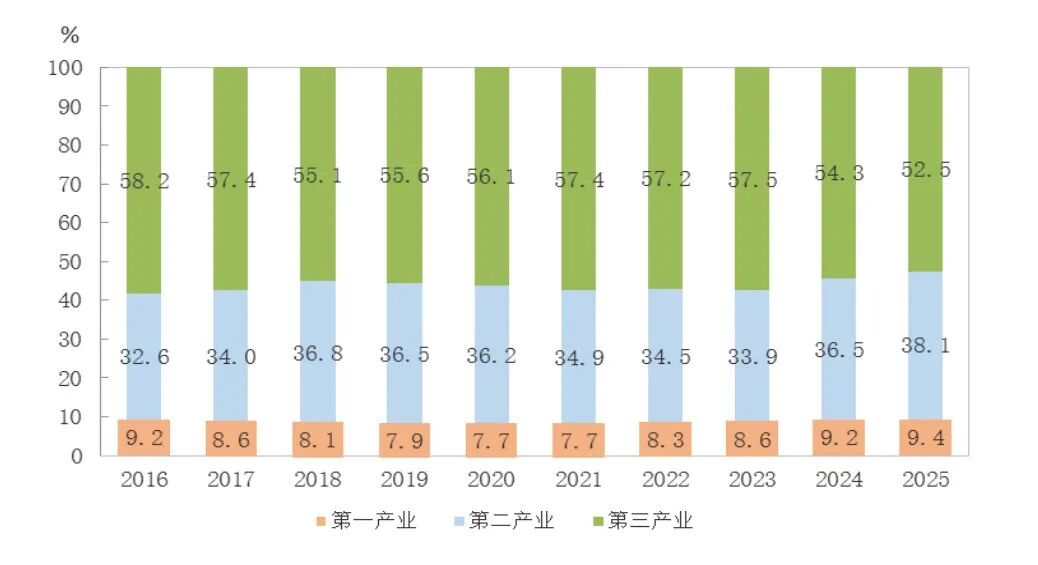 图2 2016-2025年三次产业增加值占地区生产总值比重