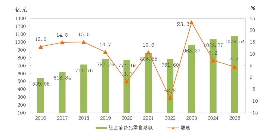图6 2016-2025年社会消费品零售总额及其增长速度