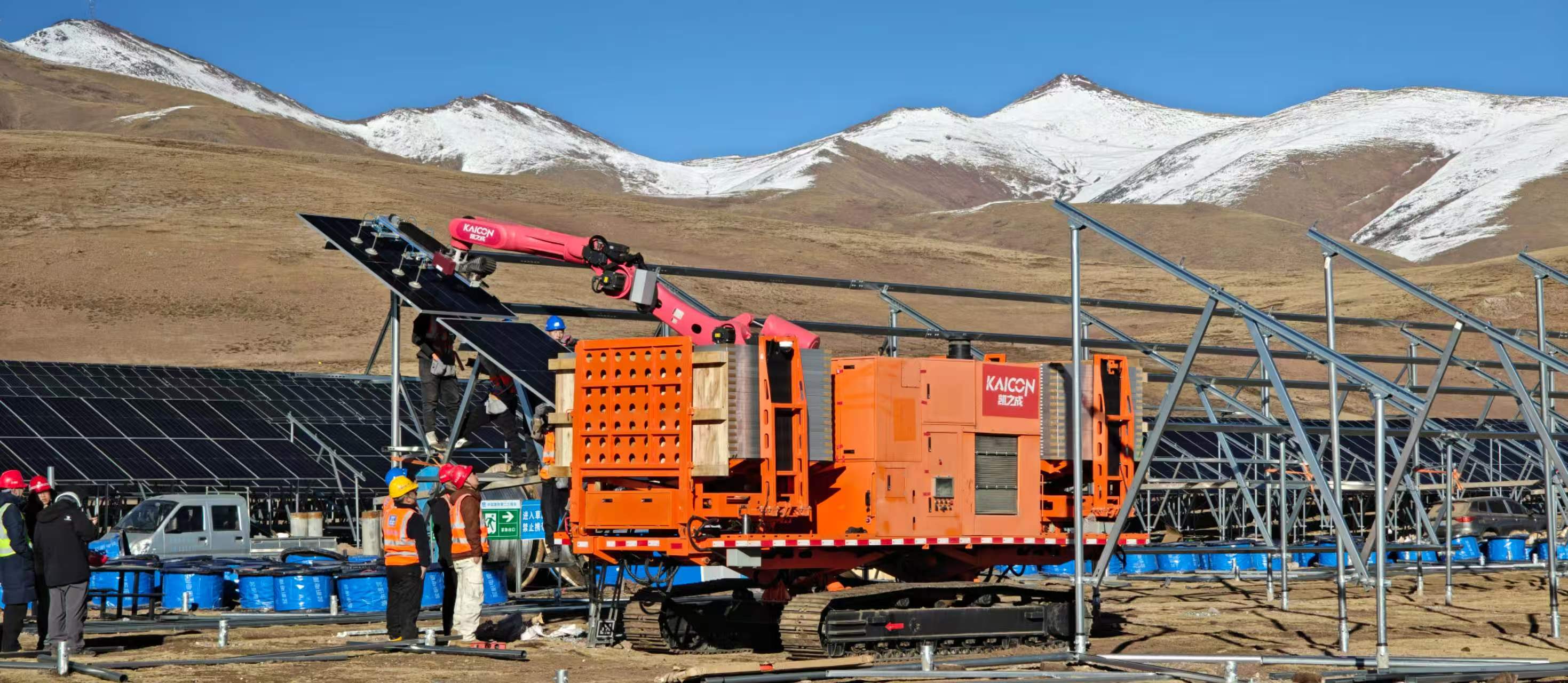 益青光伏项目场址高海拔,加之特殊地理让适宜施工的时间仅有5个月,雨雪、冰雹突袭成为常态,这让人工作业强度大、效率低、精度不足、安全风险高等问题尤为突出。“光伏板安装最费体力的就是抬板、上板,人工干一天,腰和腿都吃不消。”项目现场的工作人员回忆道。