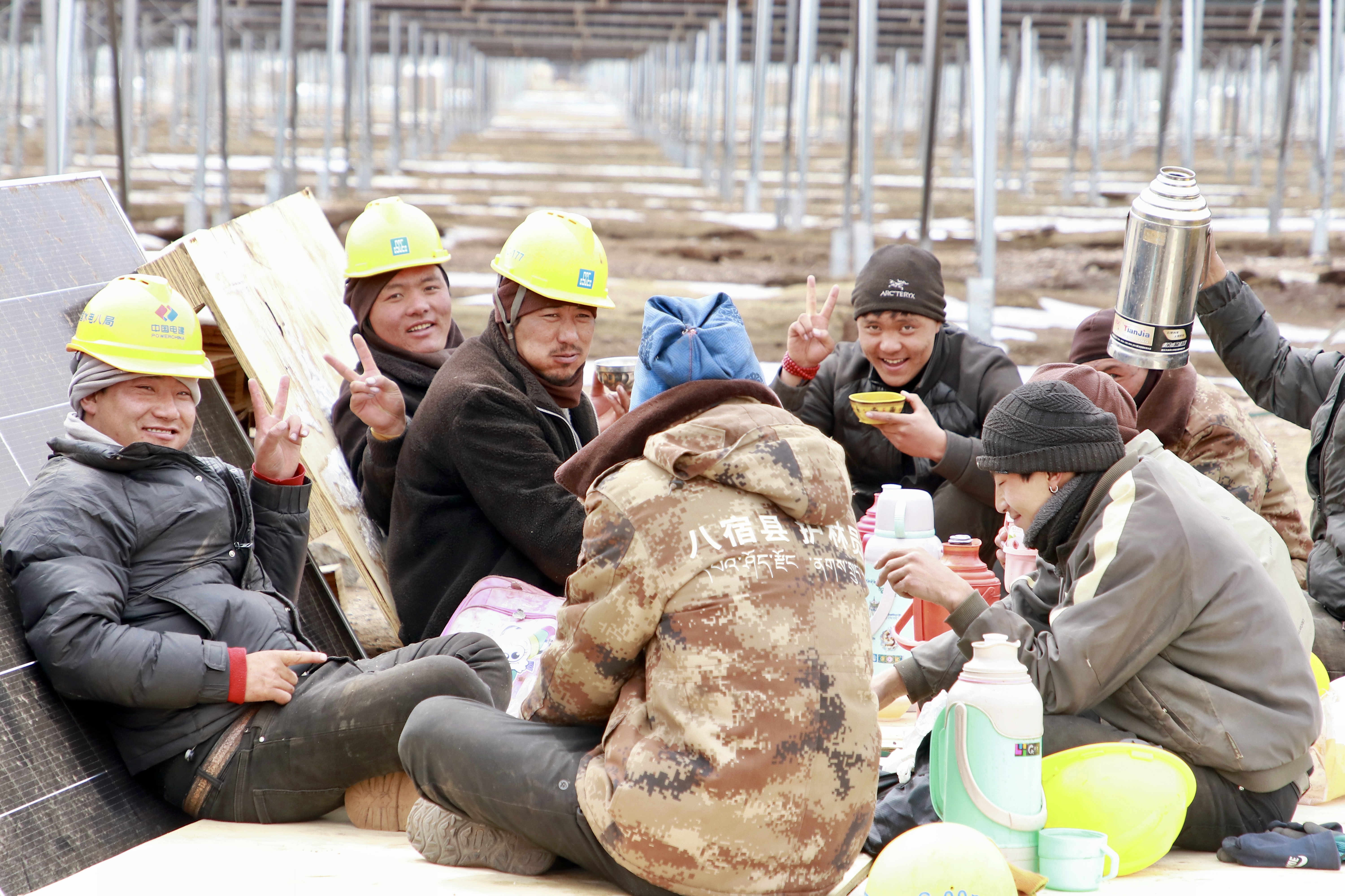 走进海拔4500米以上的项目建设点,就能真切感受到这份变化。在垒砌还未安装的光伏板中间,羊达村村民席地而坐,吃着自家带过来的糌粑和酥油茶,有说有笑,似乎寒风对他们的影响微乎其微。“我们一天能赚260块钱,已经是编制待遇了。”羊达村村民达瓦江村的玩笑话引得大家哄堂大笑。