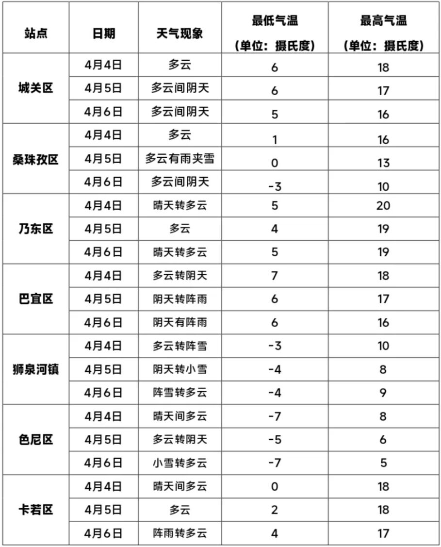 4月3日,自治区气象台发布天气消息,清明假期期间,林芝、日喀则西部和南部有小到中雪(雨)或雨夹雪,其中墨脱和波密的部分高海拔地方有大到暴雪,低海拔地方有大雨,日喀则南部的部分地方有大雪(雨);阿里西部和南部、那曲中部和东部、昌都阴天有小雪(雨)或雨夹雪,部分地方有中雪;其他地方多云间阴天,部分地方有阵雪(雨)或雨夹雪。全区自西向东有3~6摄氏度降温。那曲、阿里、昌都和日喀则南部的部分高海拔地方有7级左右大风,局地阵风可达8~10级;雅鲁藏布江一线有4级左右阵风,局地阵风可达6~8级。