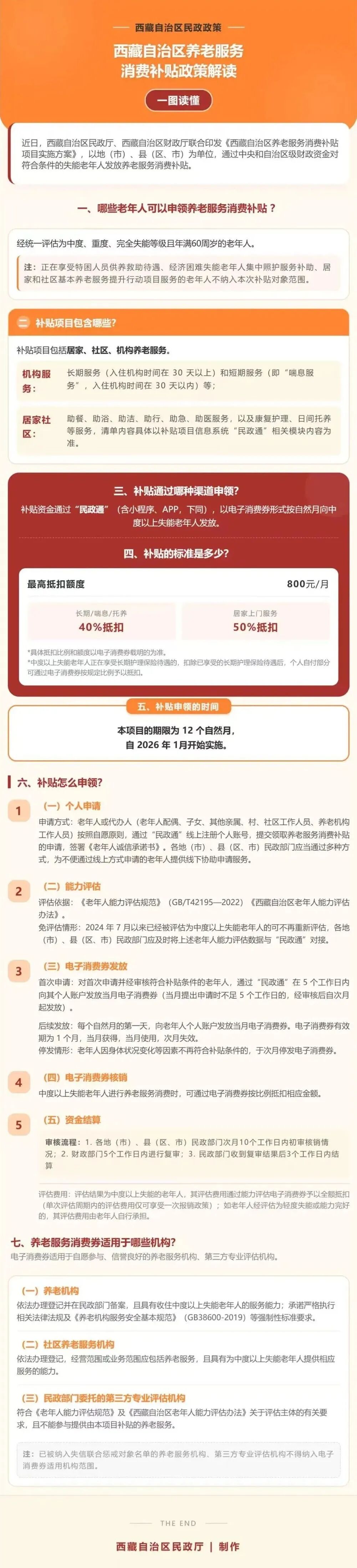 例如,老人户籍在江苏,但一直居住在拉萨市,想在拉萨购买养老服务,可以在拉萨申领消费券补贴。