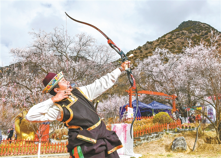 群众在桃花园表演工布响箭。记者 刘枫 摄
