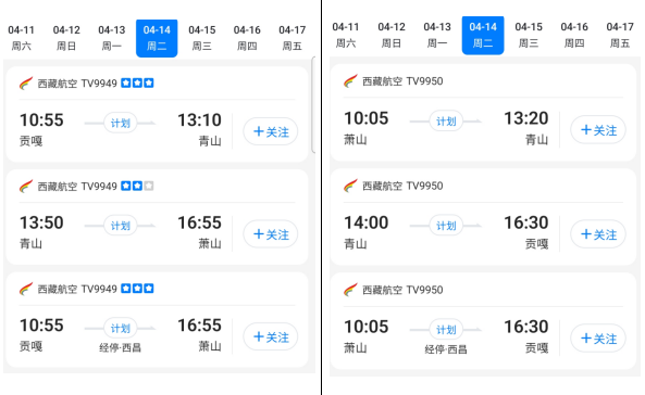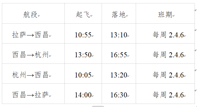 拉萨⇄西昌⇄杭州航线