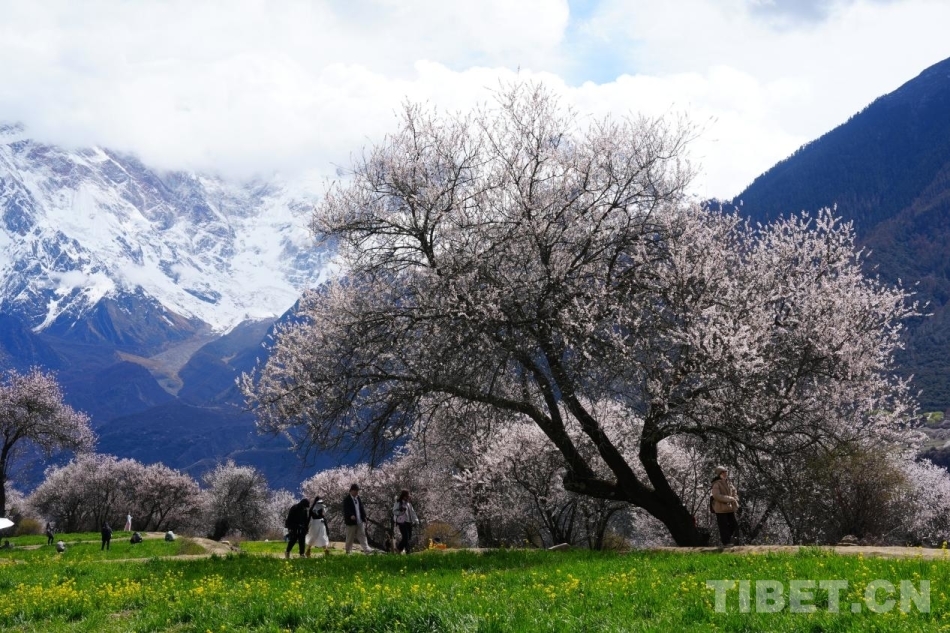 4月4日,索松村桃花树、雪山、与游人交织的景色 摄影:张艺彤