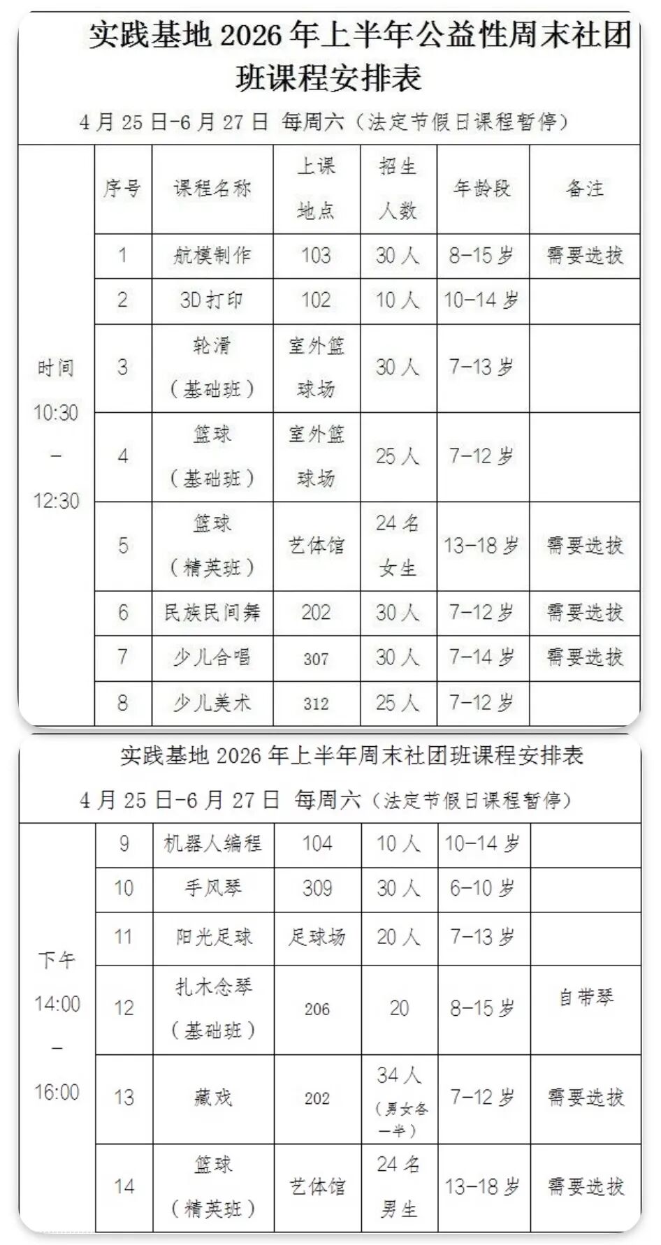 上课时间:2026年4月25日-6月27日,每周六开课(法定节假日课程暂停)上午10:30-12:30、下午14:00-16:00。