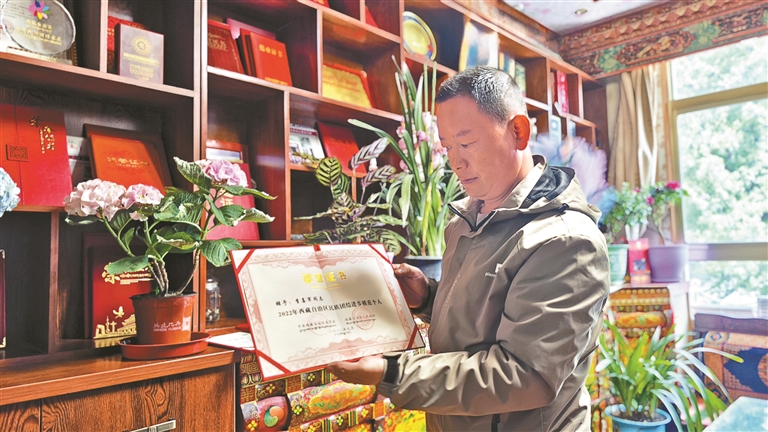 图为李喜军展示他获得的荣誉证书。记者 旦增嘎瓦 摄