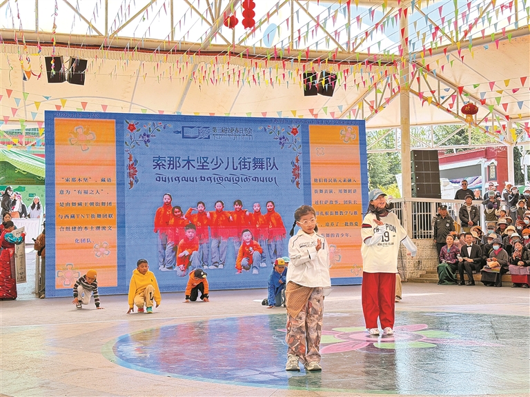 第三届“拉萨春日书会”暨拉萨市全民阅读推广周系列活动开幕式现场的少儿街舞表演。记者 晓勇 见习记者 权文娟 摄