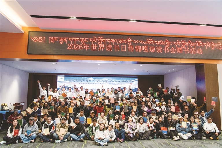 帮锦嘎琼组织的世界读书日赠书活动现场合影。帮锦嘎琼读书会供图