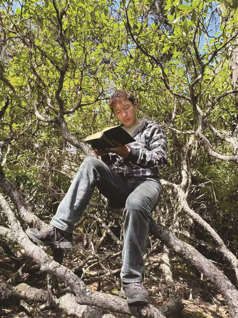 旦增在闲暇之余阅读书籍。图由受访者提供