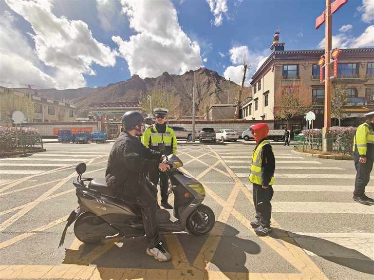 图为放学高峰时段,“小交警”在交警的指导下上岗执勤。记者 巴桑旺姆 摄