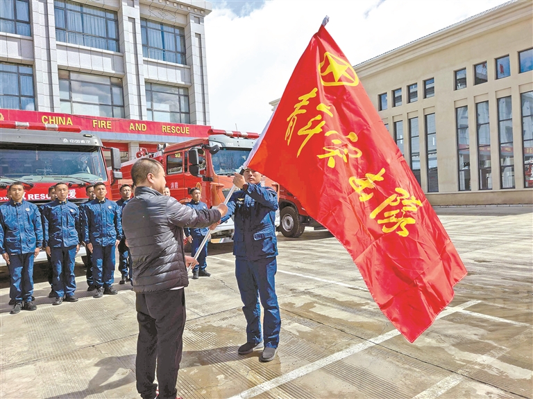 图为隆子县群团工作部开展青年突击队授旗仪式,通过为县消防救援大队“火焰蓝”青年突击队授旗的形式,增强消防指战员为民服务的荣誉感与责任感。记者 丹增平措 摄