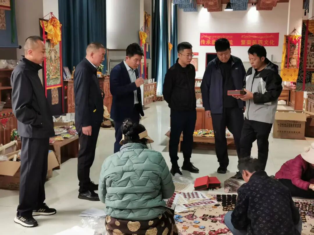 图为桑珠荣合作社的负责人西绕尼玛(右一)向来访人员介绍合作社各类特色产品。