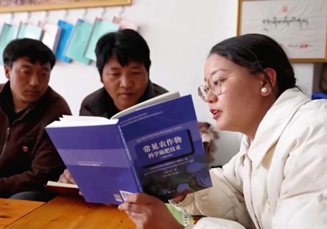 图为科技专干斯朗曲珍(右一)在与村民们一起讨论研究农作物种植技术。