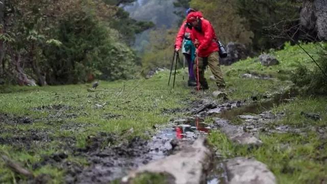 越往下走,越来越觉得暖和,空气中的湿度也增大很多,虽然没有高原反应了,但是整个摄制组的体力都到了极限,行进的速度也越来越慢,平常很少运动的我,整个右腿都无法弯曲,只能用登山杖蹒跚着前进。虽然走得很慢,摄制组对美景的拍摄却一刻都没有放松。在经过沼泽的时候,树与岩石合体生长,有的树将石头包裹起来,有的石头上长了两棵连体树,让我怀疑自己是不是到了柬埔寨的暹粒,甚至还有粗达几个人合抱的朽木倒在地上,被各种不知名的藤蔓缠绕着,青苔则模糊了沼泽与树木之间的距离,阳光从树叶的间隙中射进来,在原始森林深处的雾霭中,劈开一道道光痕,彷佛在提醒这片森林,它才是万物之主。与此同时,森林里还有悉悉簌簌的声音,伴随着树叶的晃动,让人立在枯叶上,感觉时间在这里已经凝固,彷佛千百年来就是这样,也将这样下去。