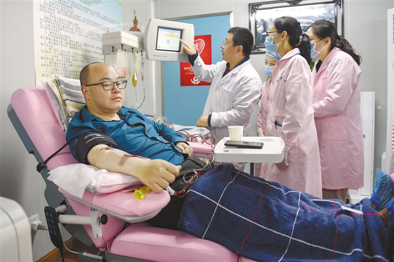 图为9月18日,志愿者廖志霖(左一)通过机采血小板进行献血,西藏自治区血液中心工作人员在专家指导下学习采集血小板技术。记者 晋美多吉 摄