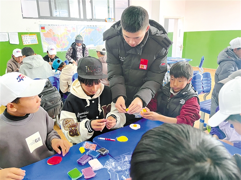 图为支教队员余梓鑫和孩子们一起完成课堂小游戏。
