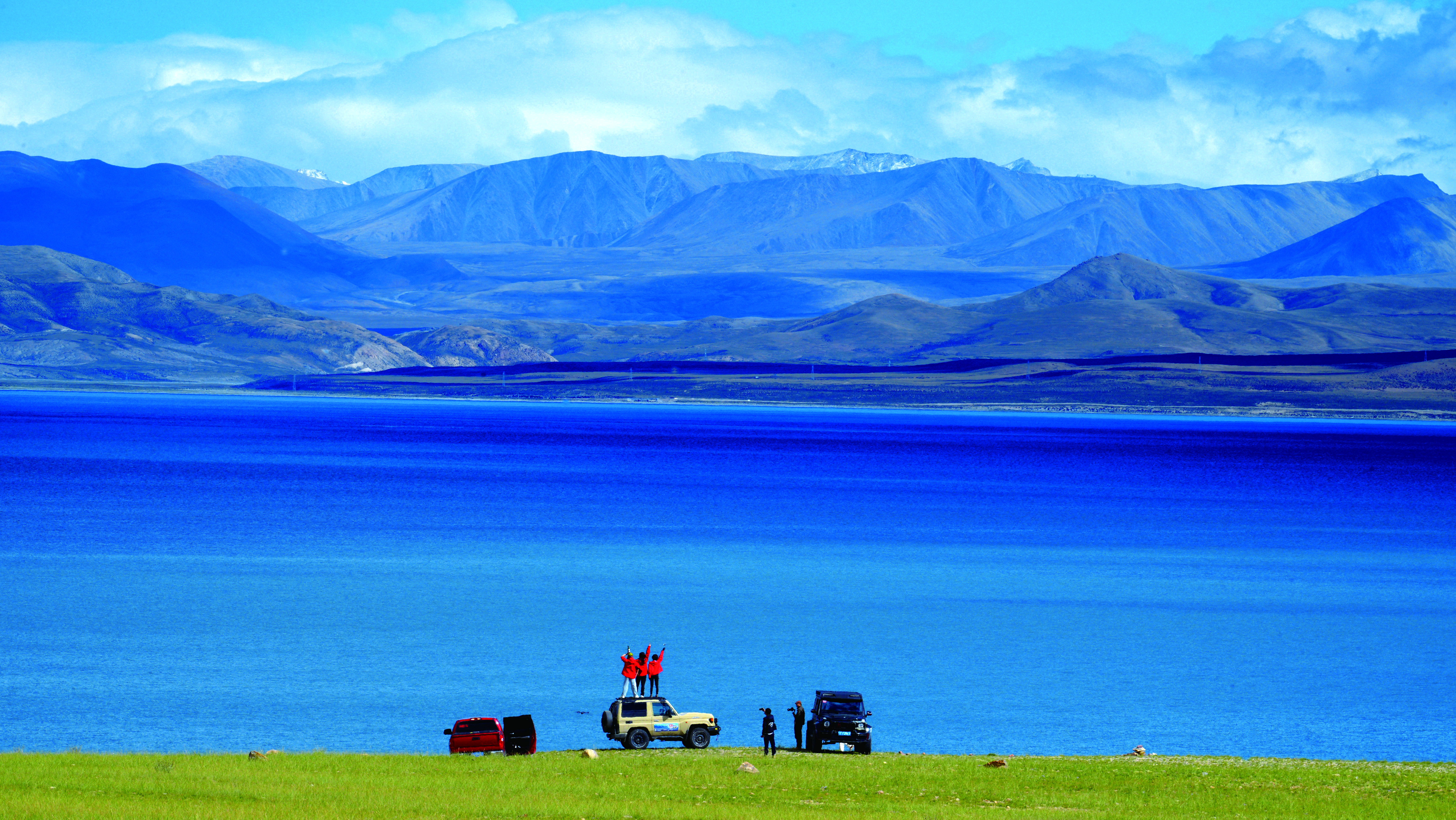 参加“天上阿里·云巅自驾”自驾大会活动的游客在玛旁雍错湖畔游玩。