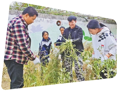 师范生杨鹏鑫(右二)带领学生在劳动课上除草。图片为陕西师范大学提供