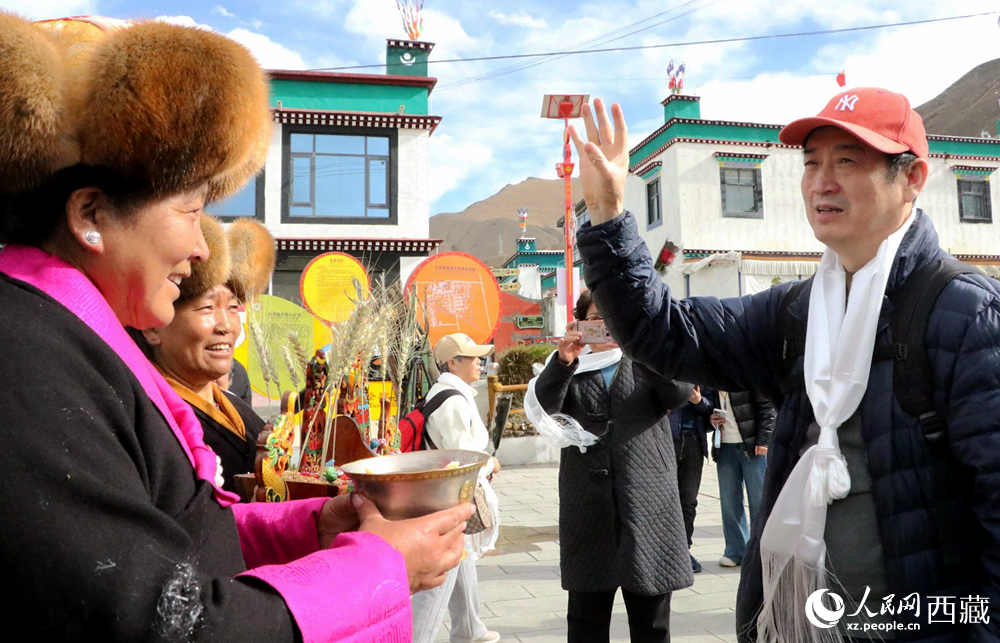 藏族同胞向游客敬献青稞酒。人民网记者 吴雨仁 摄