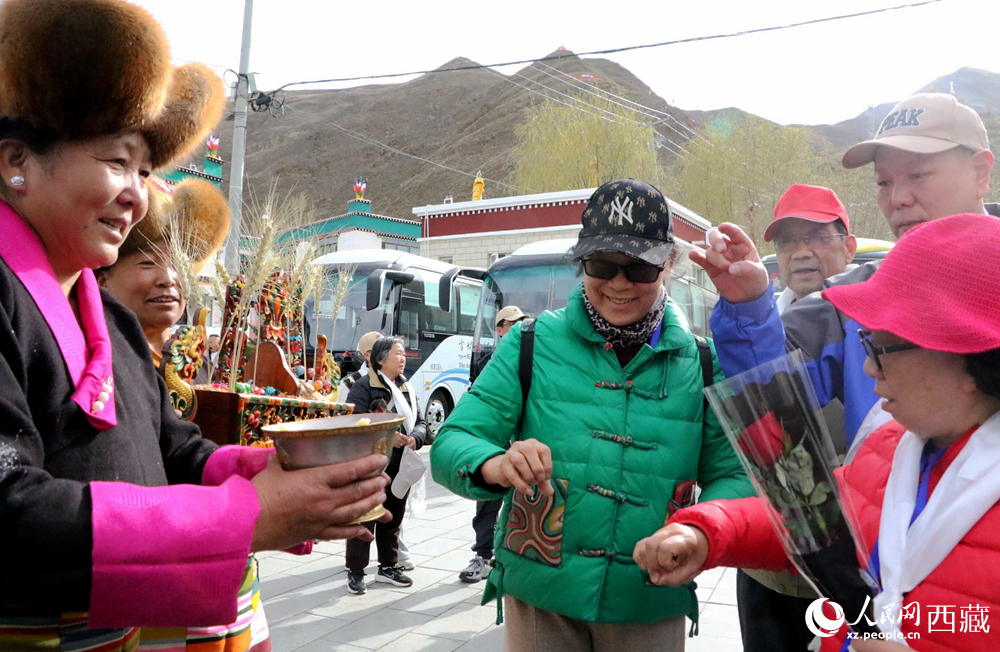藏族同胞向游客敬献青稞酒。人民网记者 吴雨仁 摄