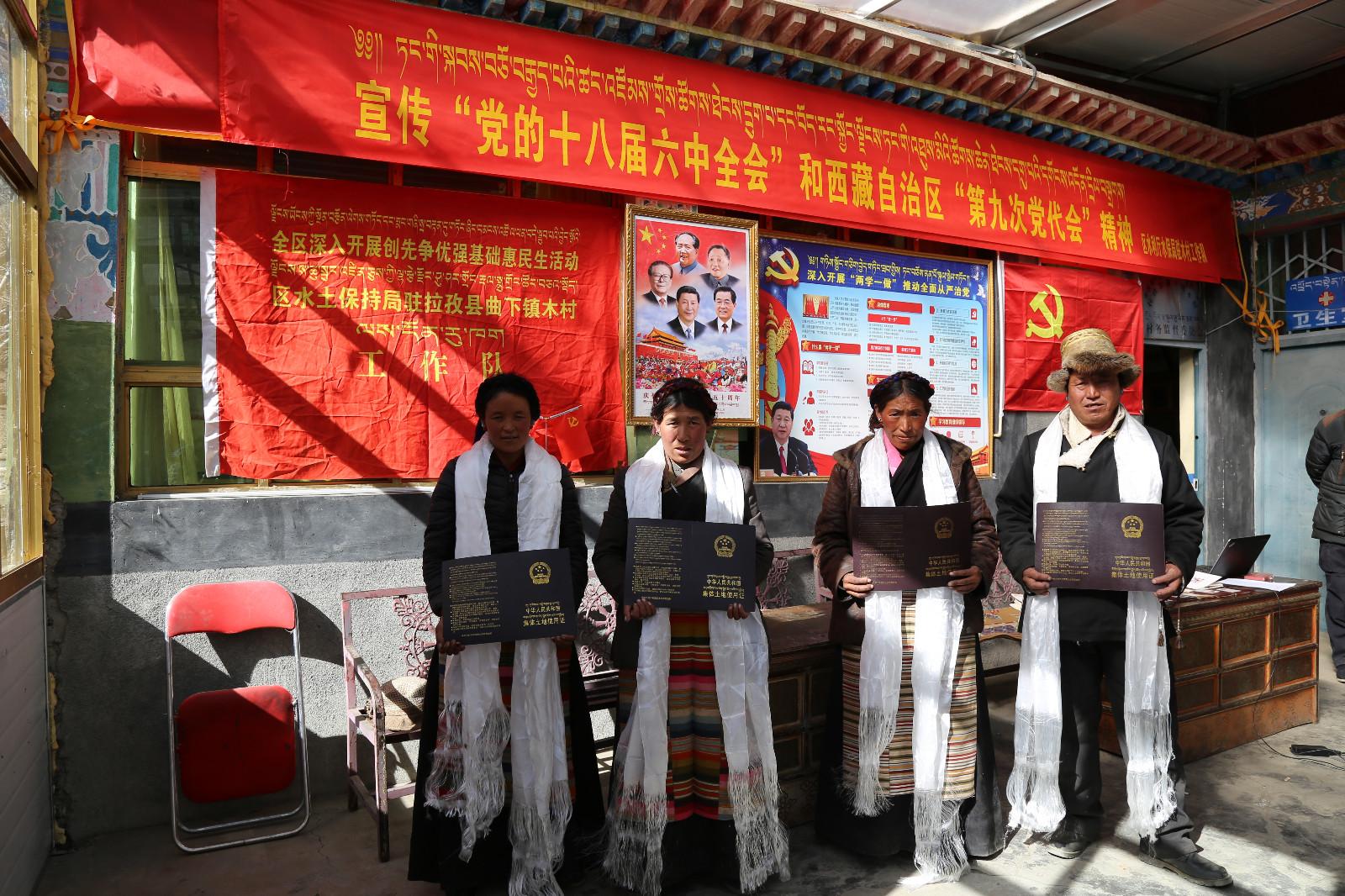 1月22日,西藏自治区水利厅水土保持局驻拉孜县曲下镇木村工作队为当地村民发放土地证。